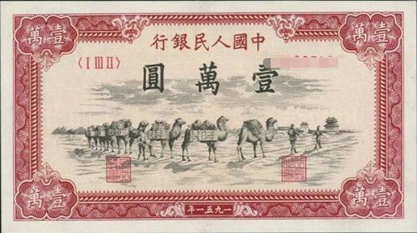 第一套人民币一万元“骆驼队”,人民币中唯一使用挪威生产的道林纸的钞票,数量稀少一版四大天王之一。目前市场价格已经到了4万元以上。