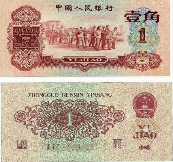 第三套人民币的1962年发行“枣红一角”。与同年代发行的2角券(长江大桥)相混淆背面的绿色容易混淆,所以1967年就退出流通。最初市场背绿水印壹角和背绿一角并无太大差异,后经收藏爱好者发现其特殊性和存世量更少,经过几十年沉淀后目前已成为第三套人民币币王,三版纸币五张精品之首。“背绿水印一角”的身价已经达到4万左右。