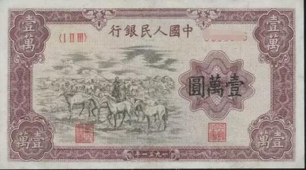 牧马图为第一套人民币币王,可以说单张价格抵得上半套第一套人民币,未见有全品新相,九成以上据告不过五张,非常的稀缺珍贵。市场价格高达数几百万的人民币。